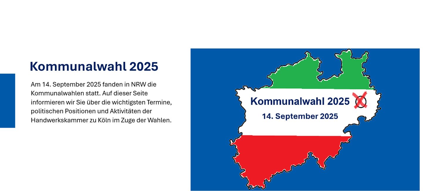 Fragenkatalog an die Kölner OB-Kandidierenden: Anlässlich der Kommunalwahl 2025 in Nordrhein-Westfalen hat die Handwerkskammer zu Köln alle Oberbürgermeisterkandidierenden der in Fraktionsstärke im Kölner Stadtrat vertretenen Parteien dazu eingeladen, einen Fragenkatalog zu handwerkspolitischen Themen zu beantworten. Die folgenden Antworten geben die Aussagen der jeweiligen Parteien im Wortlaut wieder (Stand: August 2025). Wir möchten Sie als unser Mitglied damit umfassend und transparent zu den wichtigsten handwerkspolitischen Themen informieren. HERUNTERLADEN: Forderungspapier Kommunalwahlen 2025: Unter dem Motto "Wir können alles, was kommt – wenn die Rahmenbedingungen stimmen!" hat die Handwerkskammer zu Köln in sechs thematischen Schwerpunkten zentrale Erwartungen des regionalen Handwerks an Politik und Verwaltung formuliert. HERUNTERLADEN: |