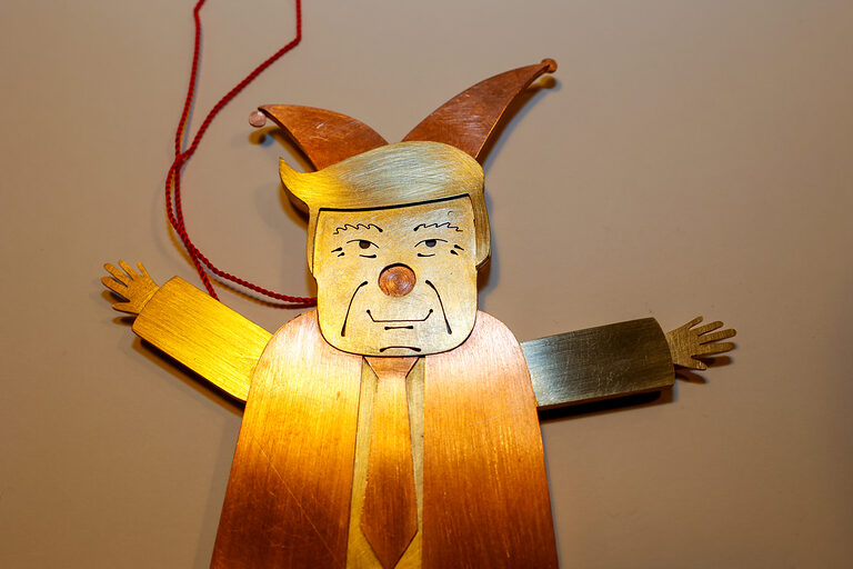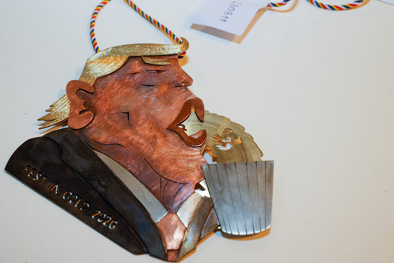 Den "Community Preis" erhielt Greta von Gersum (Zeichenakademie Hanau, Hanau) für den Orden Trumpelmann. Donald Trump erscheint hier als Hampelmann im Narrenkostüm, was symbolisiert, dass er kein König ist. Gleichzeitig zeigt der Hampelmann, wie Trump herumhampelt und oft fragwürdige Entscheidungen trifft.