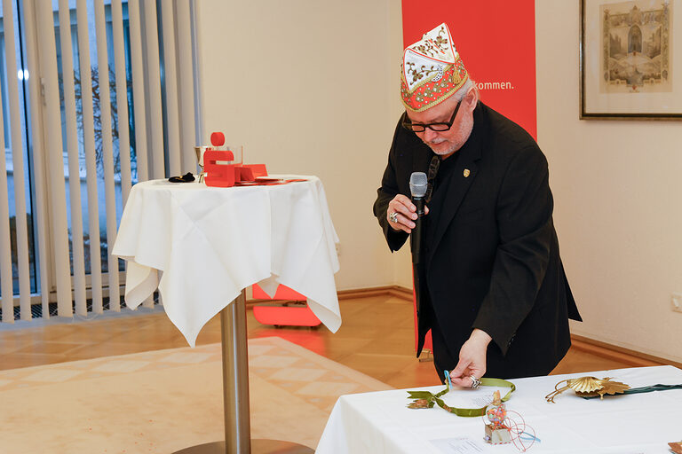Ingo Telkmann, Präsident Fest in Gold e.V.: "ALAAF – Mer dun et för Kölle – In Anlehnung an das aktuelle Sessionsmotto haben 15 Nachwuchskräfte des Gold- und Silberschmiedehandwerks mit viel Leidenschaft und großem handwerklichen Geschick dem Ehrenamt wunderbare 'Denkmäler' gesetzt, aber auch den sogenannten Mächtigen mit der Narrenpritsche eins mitgegeben. Wir sind sehr stolz auf diese Handwerkstradition und bedanken uns bei allen, die dazu beitragen, insbesondere den Ausbilderinnen und Ausbildern und bei unseren Unterstützern: Kreissparkasse Köln, Kreishandwerkerschaft Köln, Handwerkskammer zu Köln, Signal Iduna Gruppe, Festkomitee Kölner Karneval von 1823 e.V."