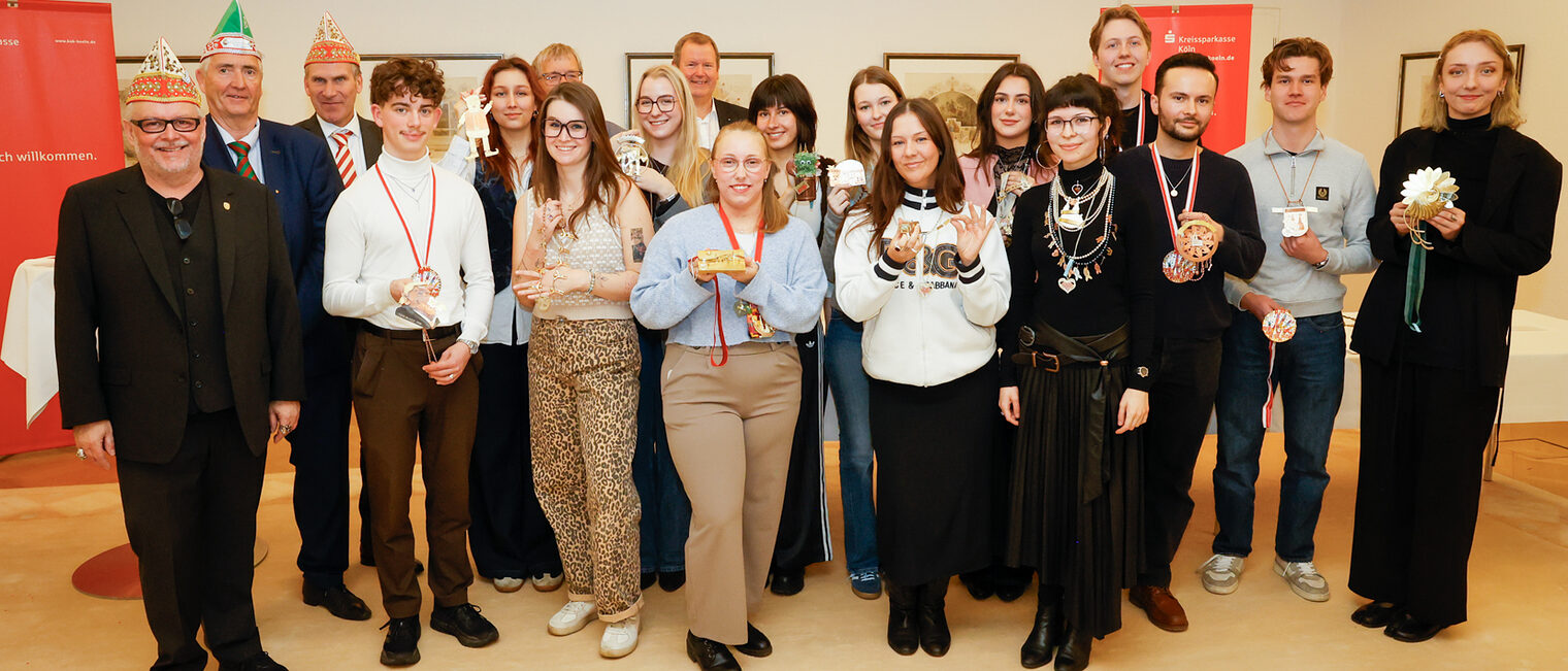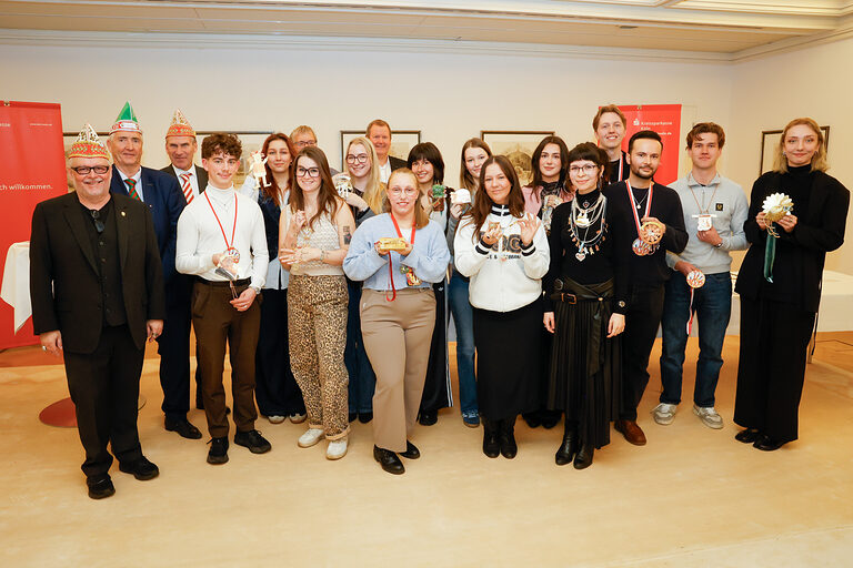 Gruppenbild mit Preisträgerinnen und Preisträgern sowie Juroren und Veranstaltern anlässlich der Ehrung der Junggoldschmiede in der Kreissparkasse Köln am 14.1.2026