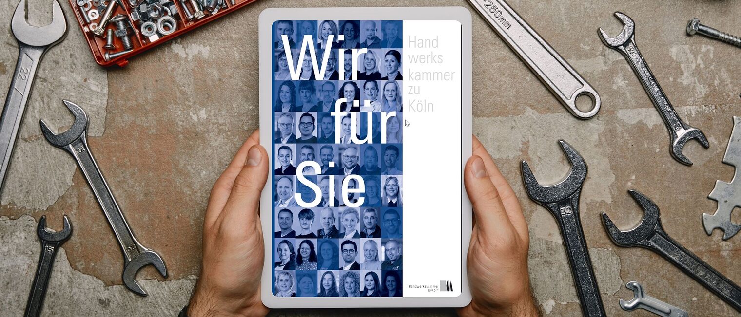 Für diese und viele weitere Anliegen sind Sie auf dieser Seite genau richtig: In unserer Broschüre "Wir für Sie" erhalten Mitgliedsbetriebe und Handwerkerinnen und Handwerker einen guten Überblick über das Dienstleistungs- und Bildungsangebot der Handwerkskammer zu Köln – von A wie Ausbildungsberatung bis Z wie Zwischenprüfung auf dem Weg zum Gesellenbrief.
