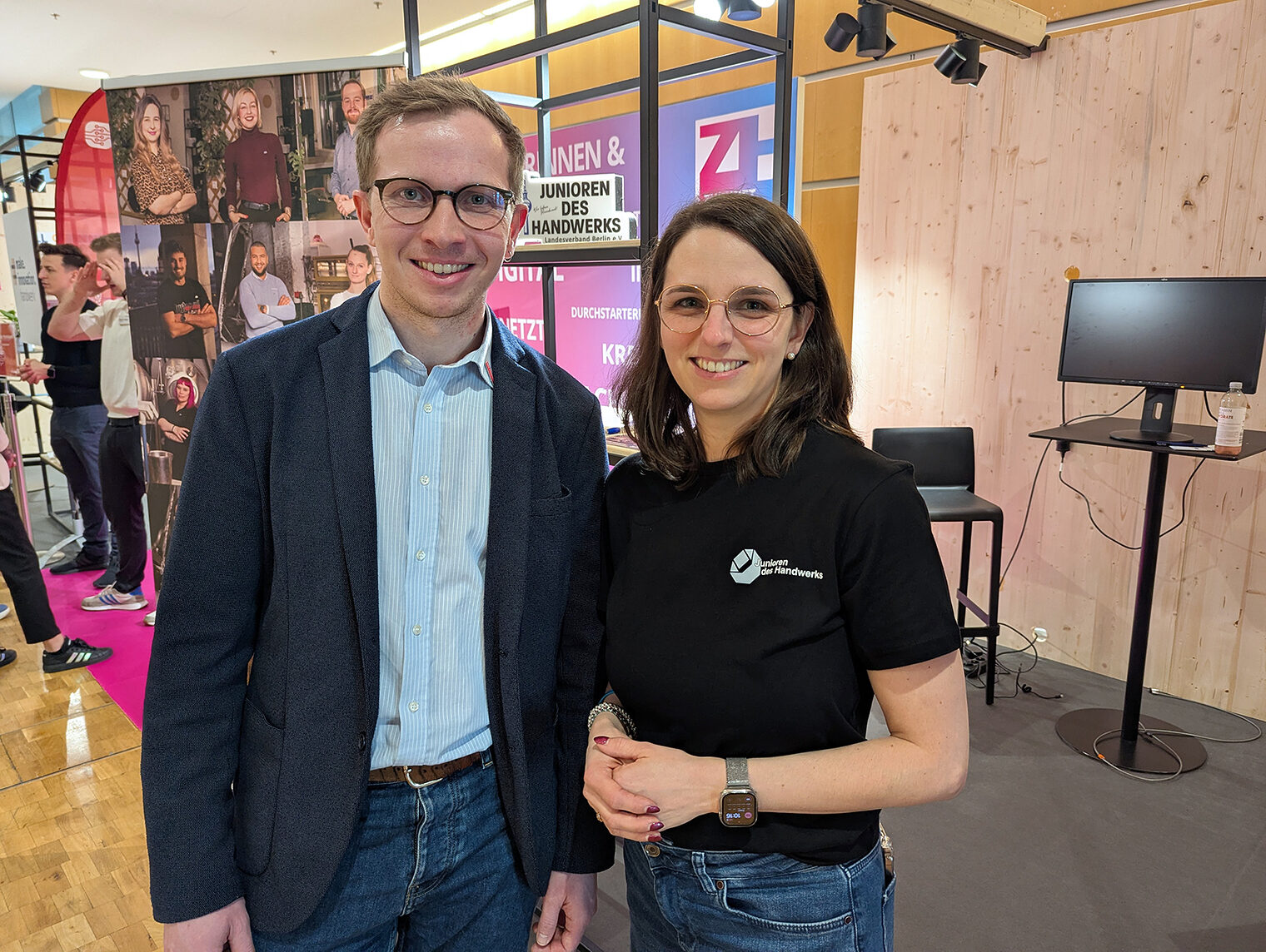 Auch die ► "Jungen Handwerksunternehmer:innen" der HWK Köln waren in München vertreten: Netzwerk-Sprecherin Carina Straub und Koordinator Tobias Heck besuchten auf der ZUKUNFT HANDWERK spannende Panels unter anderem zum Thema Künstliche Intelligenz (KI) und führten viele Gespräche. Vor allem tauschten sie sich mit Handwerksjuniorinnen und Handwerksjunioren aus ganz Deutschland aus, darunter zum Beispiel Sara Hofmann.