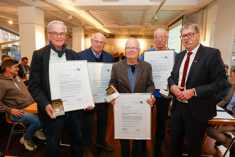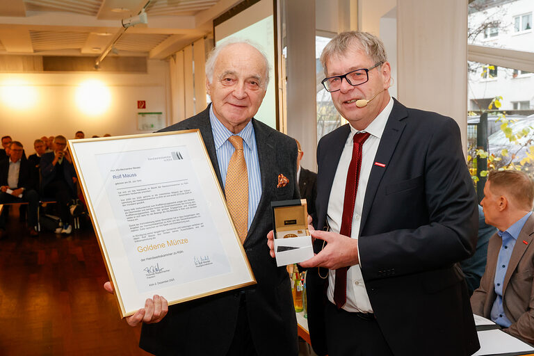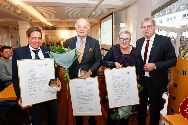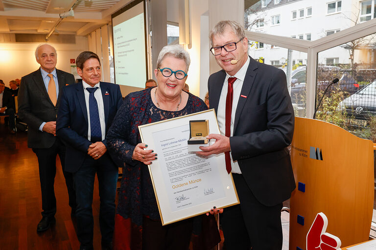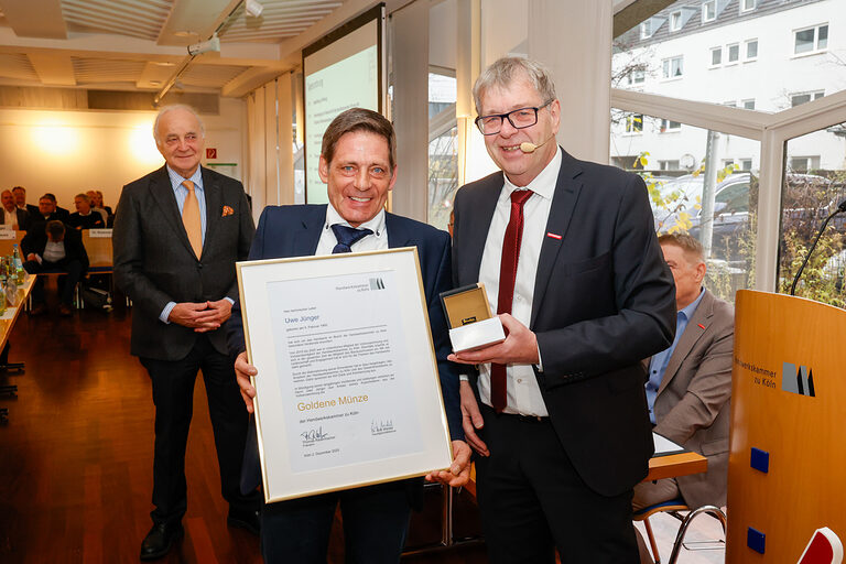Zu den Programmpunkten der Herbstvollversammlung gehörten auch die Ehrungen verdienter Ehrenamtsträger aus dem Handwerk. Ingrid Lohmar-Micklin und die beiden ehemaligen Vorstandsmitglieder Uwe Jünger und Rolf Mauss wurden aufgrund ihres langjährigen ehrenamtlichen Engagements anlässlich ihres Ausscheidens aus der Vollversammlung jeweils mit der Goldenen Münze der Handwerkskammer zu Köln geehrt. Lothar Neuhalfen, Matthias Klose und Ralf Neumann, deren ehrenamtliche Tätigkeit kürzer ausfiel, erhielten anlässlich ihres Ausscheidens aus der Vollversammlung jeweils die Silberne Münze der Handwerkskammer. Anlässlich ihres Ausscheidens als öffentlich bestellte und vereidigte Sachverständige erhielten Hans Werner Willecke (Orthopädietechniker-Handwerk), Hans Erich Stief (Glaser-Handwerk) und Karl-Heinz Miebach (Metallbauer-Handwerk) jeweils eine Urkunde und die Silberne Plakette der Handwerkskammer zu Köln, Ulrich Bogusch (Maler- und Lackierer-Handwerk) die Bronzene. Darüber hinaus stimmte die Vollversammlung unter anderem über den Wirtschaftsplan 2026 sowie verschiedene Beschlüsse zur Berufsbildung ab.